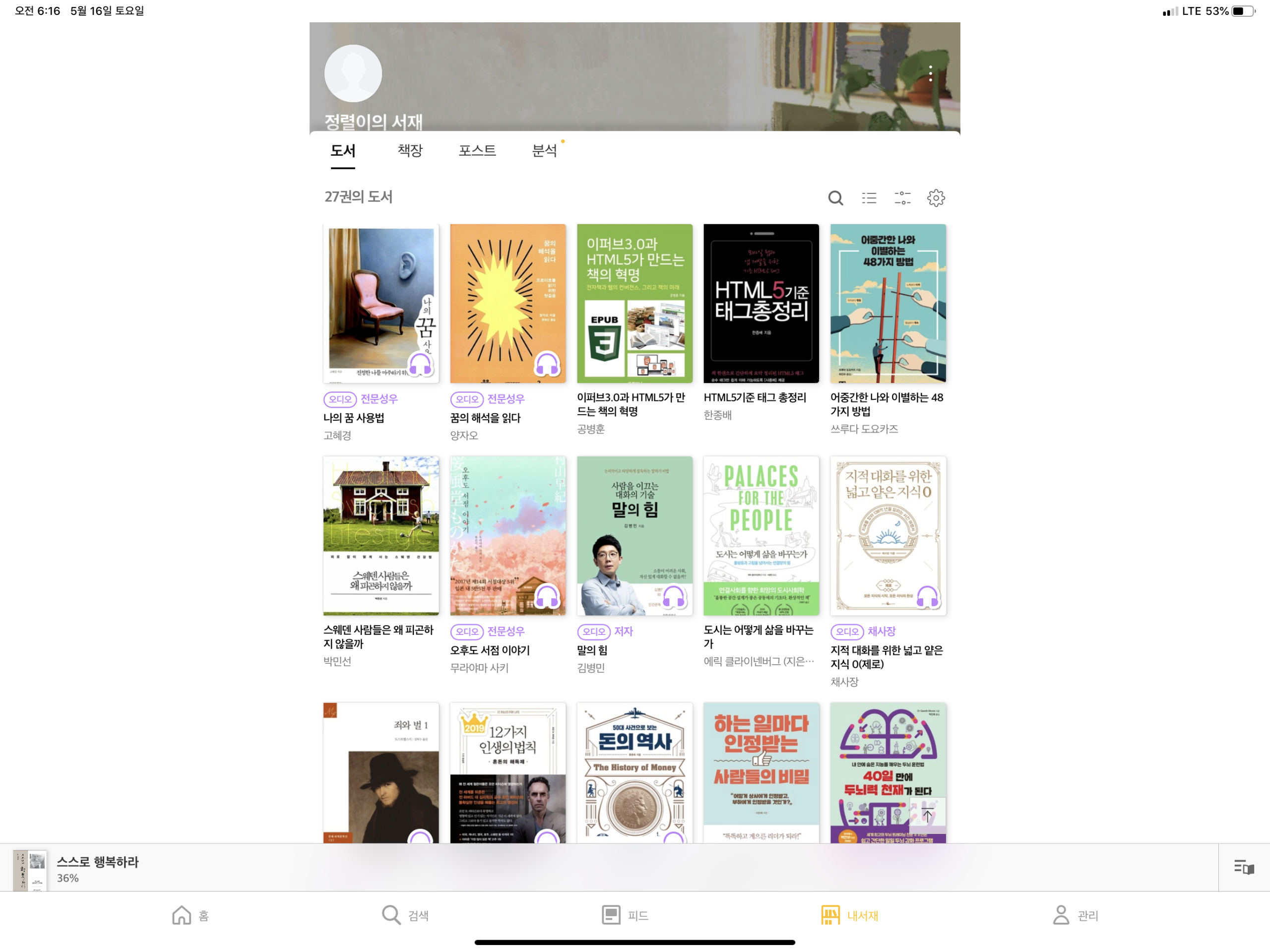 내가 담은 책들이다 오디오북들로 밤에 꿀잠 잘 수 있어서 행복하다.