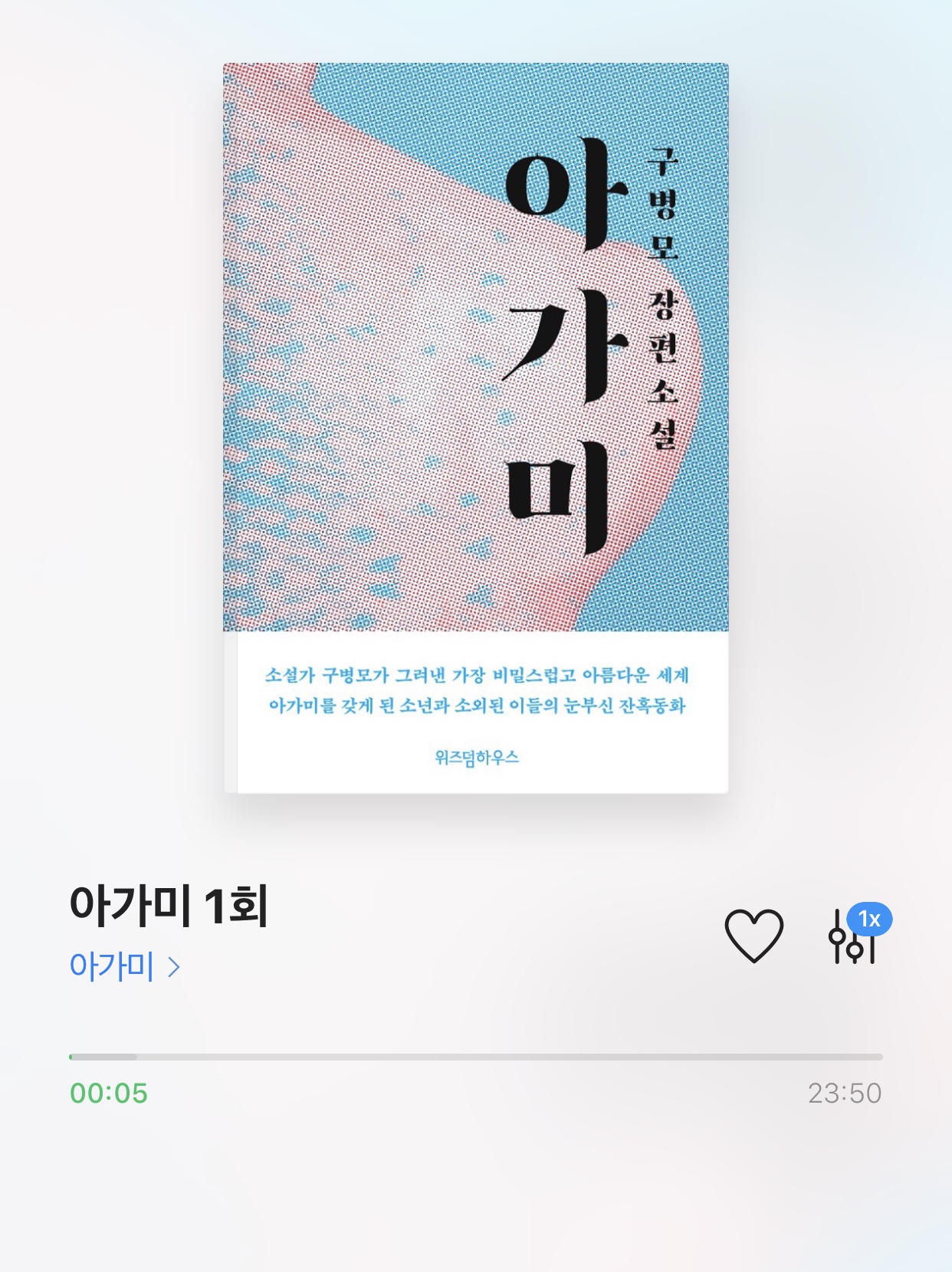 이번 책 “아가미 – 구병모 저 / 원종준 외 4인 낭독”은 5시간 정도의 분량의 책입니다.